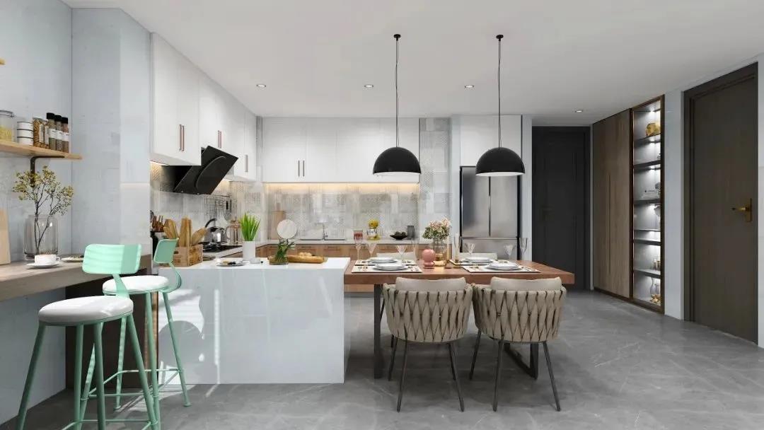 L型櫥柜設計,并且添加了一個小島臺,可以用于收納擺放,還可以作為廚房、餐廳、客廳的唯一隔斷。櫥柜是木飾面和白色的結合,再加上色澤清新,紋理新穎的墻磚,實用好看又有新意。