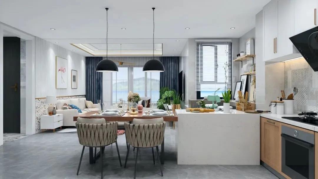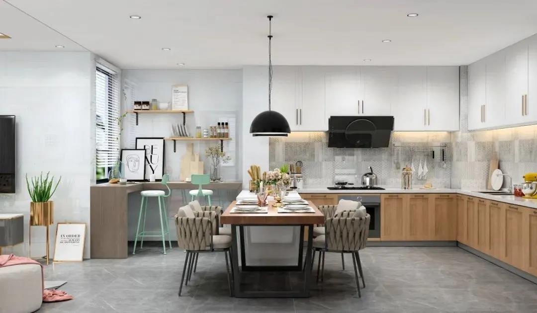 島臺旁邊延伸出來便是木飾面餐桌,這種設計參考了歐美流行的做法,一方面充分利用每一寸的空間,另一方面增加各空間的互動性??梢赃呅蕾p廚房的景色,邊來一口香氣撲鼻的美食或美酒,既溫馨且有情調。