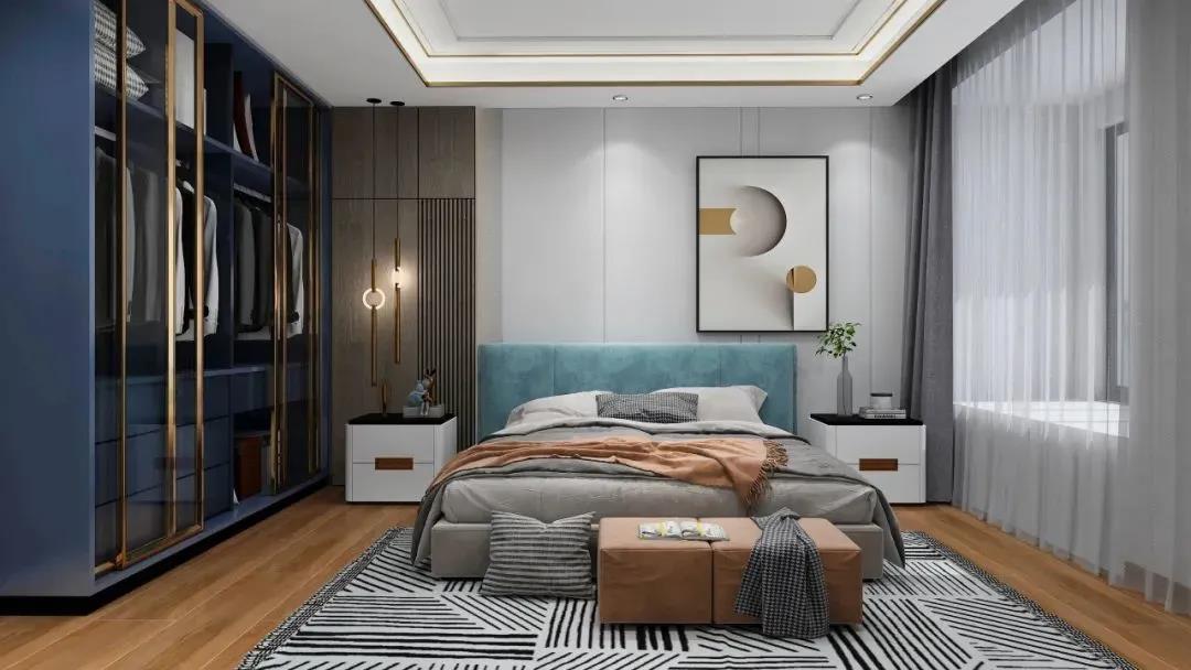 主臥室依然延續了客餐廳的獨到設計,藍白色作為主色調,看起來更加寧靜和清新,金屬材質和木飾面材質的混合搭配,簡約中透出高貴的氣質,彰顯著設計師與屋主不凡的審美。