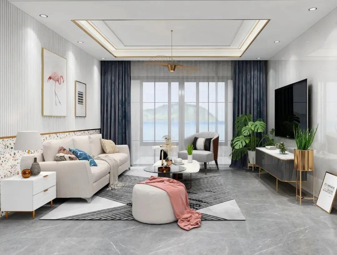 客廳的設計比較簡單,灰色大理石瓷磚營造靜謐舒適的氛圍,白色大理石瓷磚鋪貼電視背景墻,時尚、雅致、簡約、大氣。米色家具更增添了一種北歐風的極致簡潔。