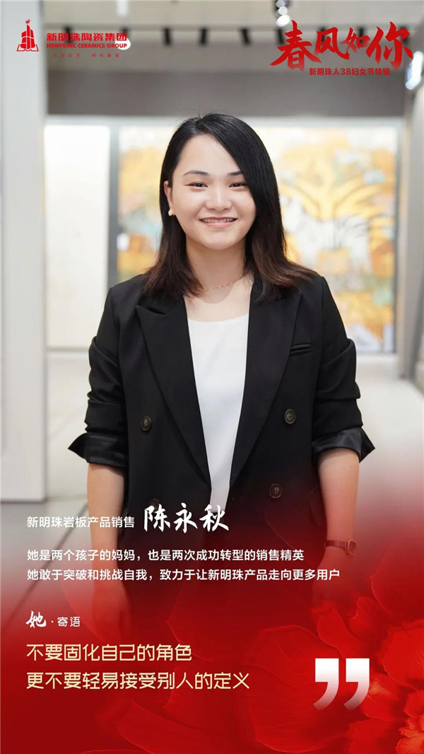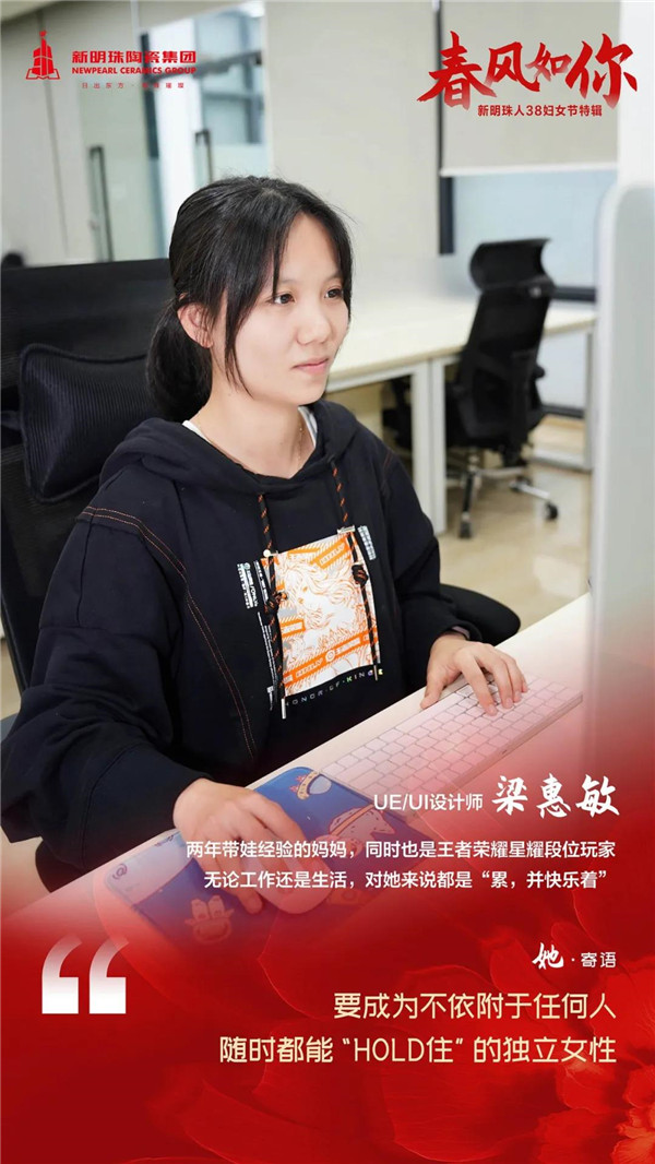 作為制造業(yè)的一員,“女性能頂半邊天“一直都是我們陶瓷行業(yè)發(fā)展歷程之中最為真實(shí)的寫照,特別是在新明珠,女性員工在各個(gè)崗位之上都發(fā)揮著至關(guān)重要的作用。她們中有的讓高品質(zhì)的新明珠產(chǎn)品走進(jìn)了千家萬戶;有的成為新明珠數(shù)據(jù)化、信息化轉(zhuǎn)型之路上的攀登者;有的為企業(yè)筑起綠色環(huán)保的護(hù)城河,有的緊守著新明珠品質(zhì)的最后一道關(guān)卡……