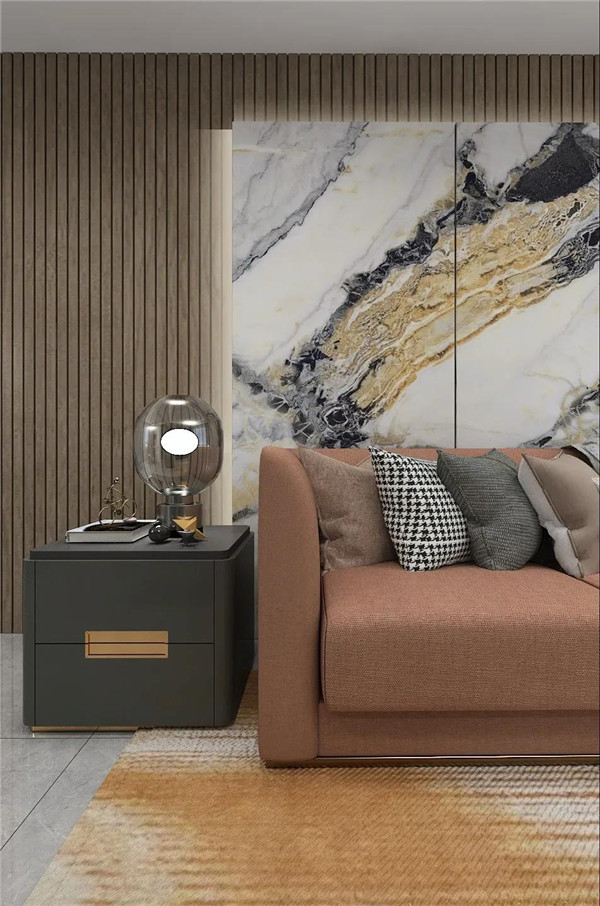 然后整個客廳的最大亮點,也是最迷人的地方是沙發背景墻。一整面的連紋背景墻鋪貼,黑灰金糅合的大流紋在白色理石上或肆意揮毫,或飄若浮云,或千峰萬壑,呈現出一番充滿藝術感的動人景致。