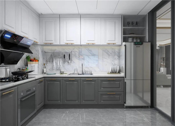 黑白灰設計的廚房,亮面瓷磚的光澤與電器的金屬光澤將現代質感氛圍烘托到極致,既簡約又顯得干凈利落。