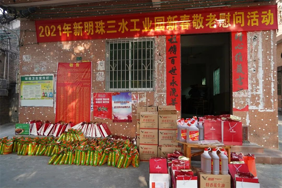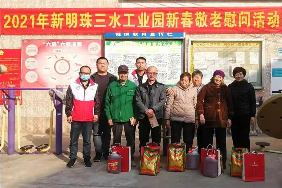 三水園區的建成和發展,離不開當地政府和廣大群眾的大力支持與理解。創富思源,回饋社會也是新明珠始終扛在肩上、放在心里的企業社會責任和公益慈善理念,自2005年開始,新明珠三水園區在每年的中秋和春節期間,都會為園區附近的周村、鄧坑村等多個村落65歲以上的老人送上節日的祝福,至今已連續進行了16年。