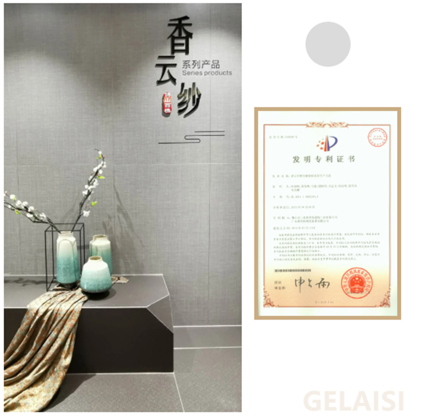 格萊斯瓷磚系列融合了東方意韻和非遺文化的涵養,將美譽為“軟黃金“的純手工絲綢面料香云紗的質感,融入到瓷磚產品的研發中,在2011年已率申請發明專利《香云紗雅光釉瓷磚及其生產方法》,并在2014年成功獲得發明專利授權。格萊斯香云紗瓷磚1.0向經典致敬,把非遺香云紗織造技藝、紋理、色澤復原到瓷磚之上。2.0打破其傳統的“物相”,以更符合現代設計的美學色系賦予時光顏色。
