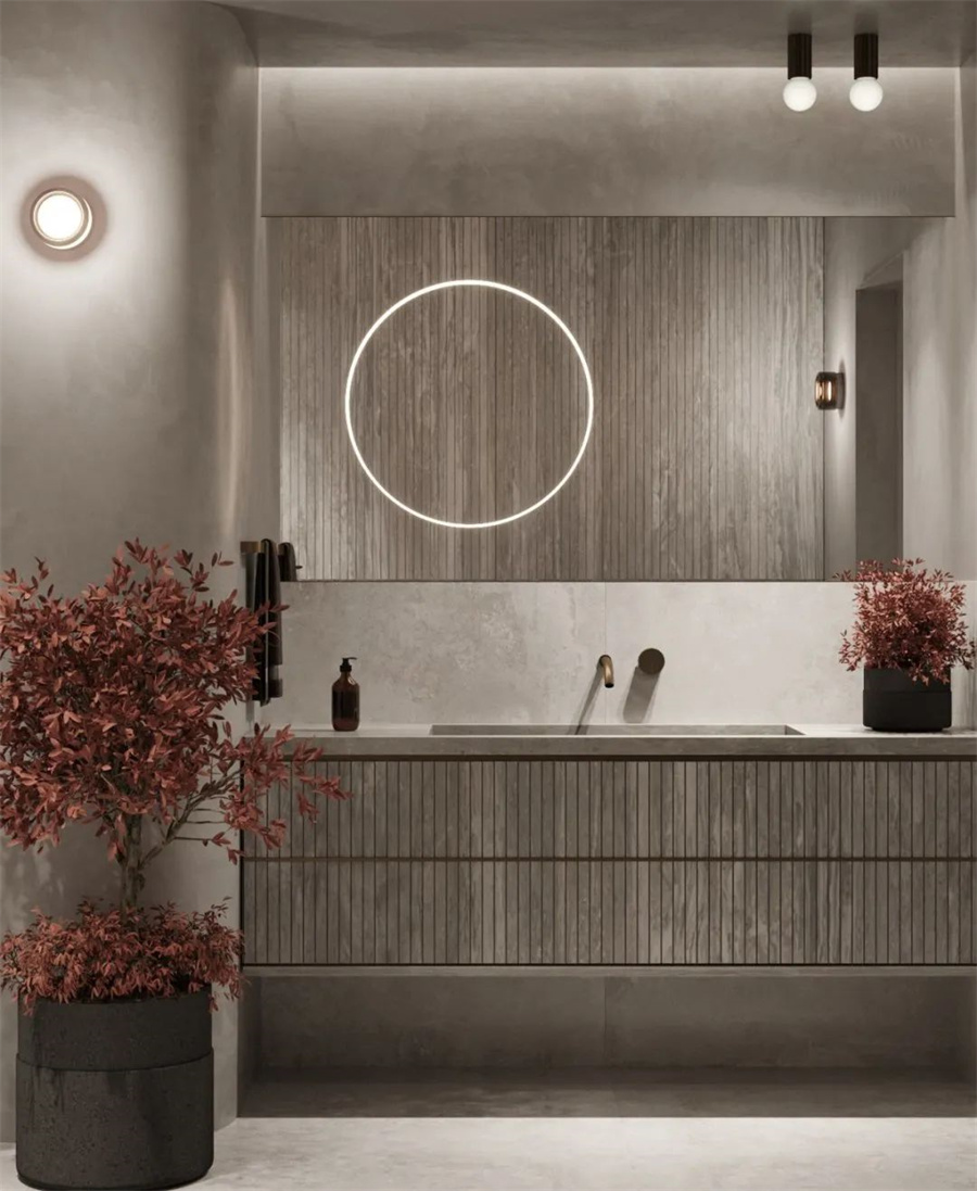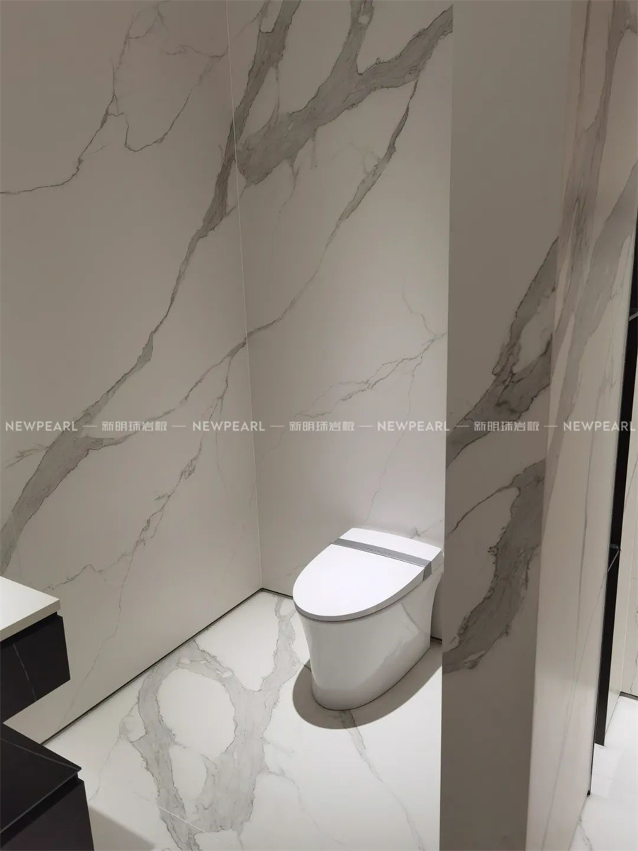 其次,說小空間不適合用巖板,其實是一種先入為主的偏見。因為在衛浴空間用巖板上墻,其實并不需要多大的空間。