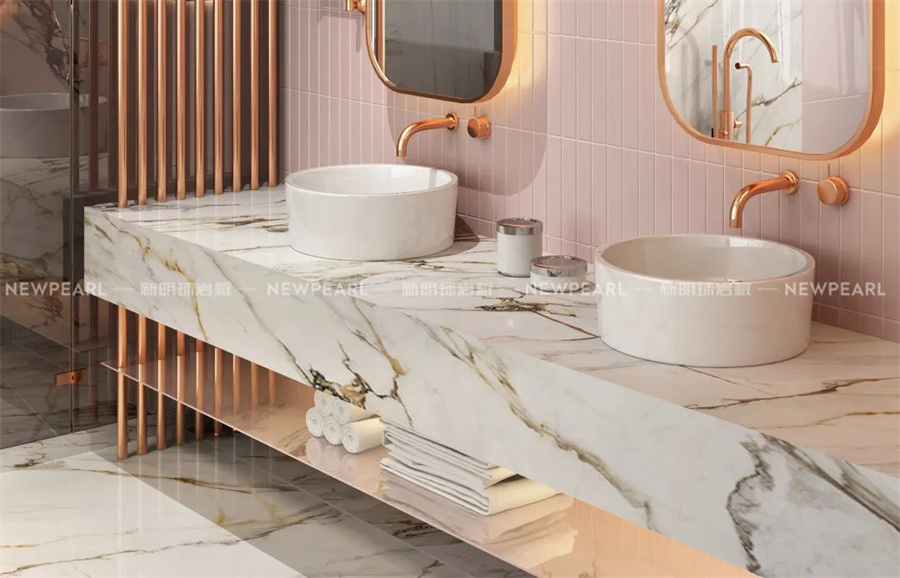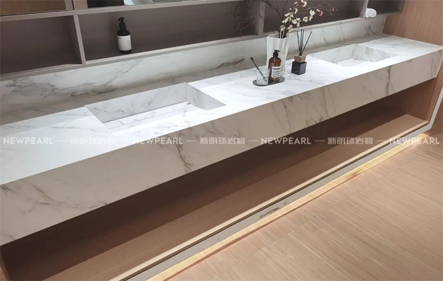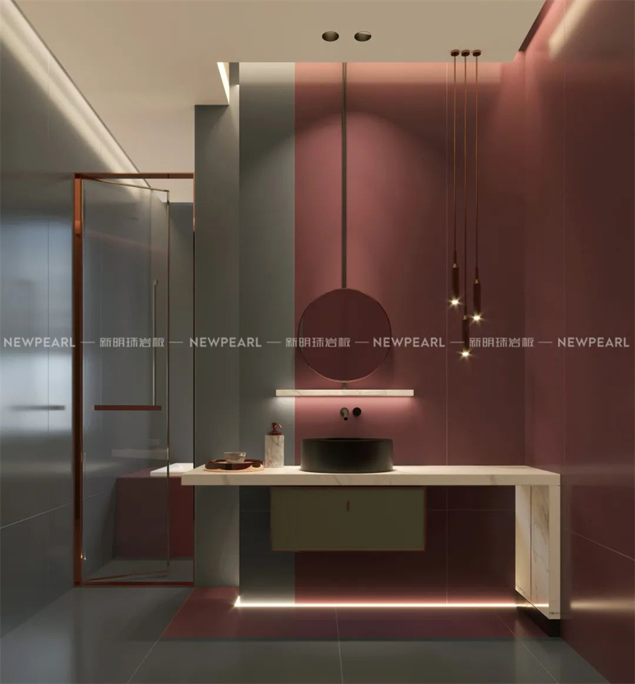 首先從實用性的角度來說,具有優秀物理性能的巖板,接近零吸水零滲透,確實很適合用在衛浴這種潮濕區域。