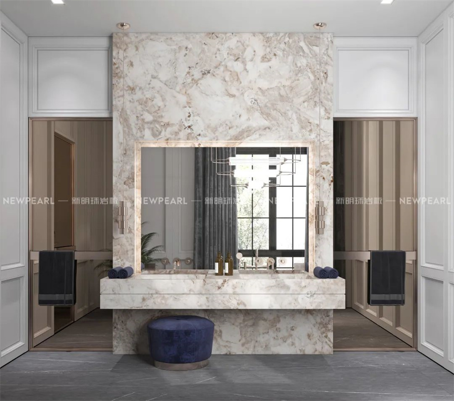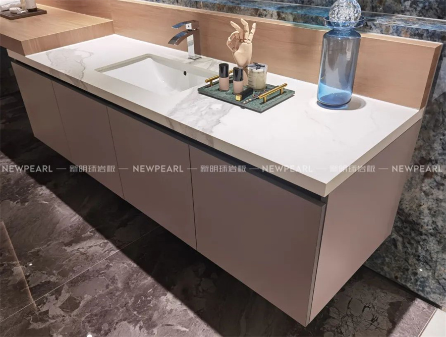 一方面,巖板憑借自身優良的物理性能、豐富的紋理質感以及強大的可加工能力,跨界進入衛浴行業,被許多廠家、家具品牌搭配實木、不銹鋼等材質,應用在各式衛浴成品當中。
