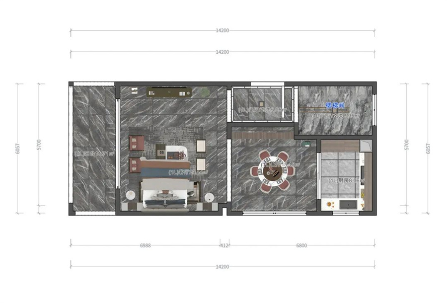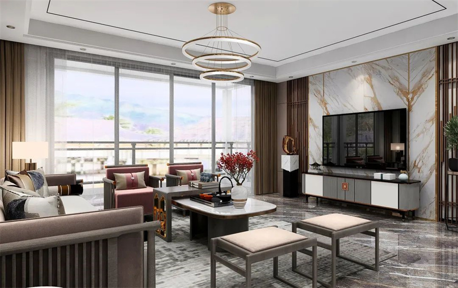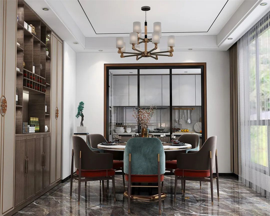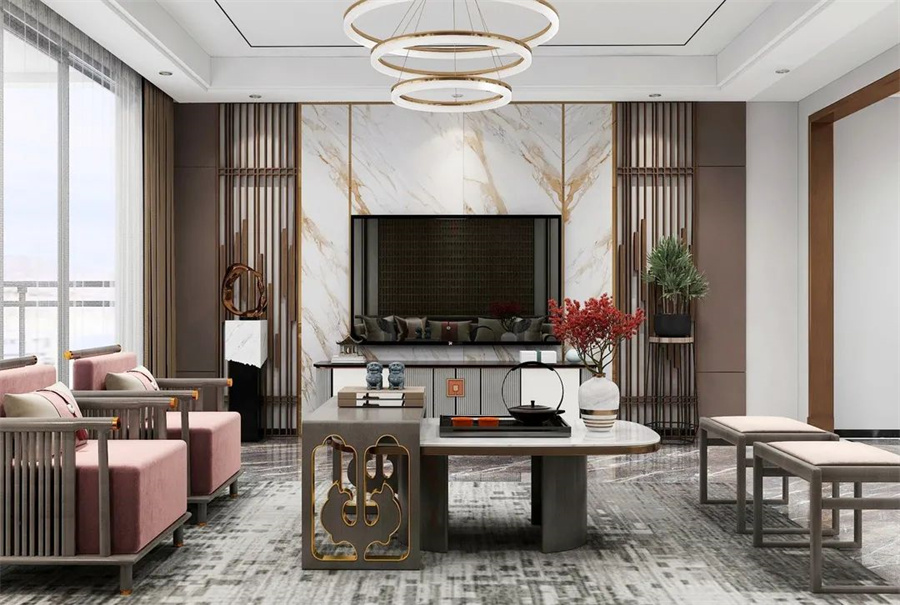 中式的純銅吊燈下,柔和的燈光映照在大流紋棕色理石瓷磚上,即大氣時尚,又舒適溫馨。