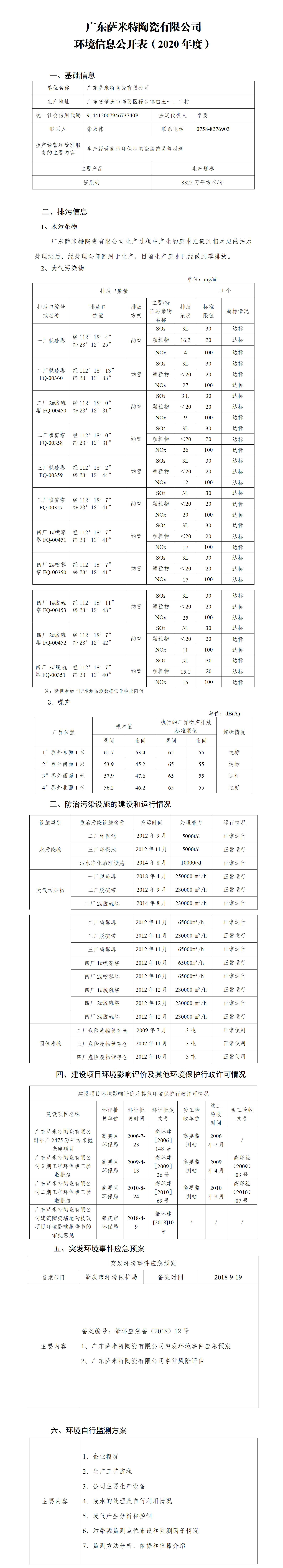 廣東薩米特陶瓷有限公司環境信息公開表(2020年度)
