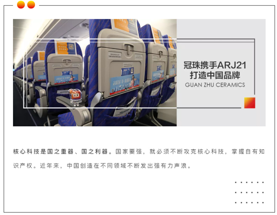 冠珠與國產飛機ARJ21牽手合作,展現了不同領域上中國創造的力量,讓中國“智造”的榮光翱翔藍天。未來,冠珠將繼續以科技創新作為品牌發展的強大引擎,研發生產兼具實用價值和文化價值的品質產品,智造中國瓷磚硬實力,讓中國品牌長虹,助推中國瓷磚品牌走向世界舞臺。