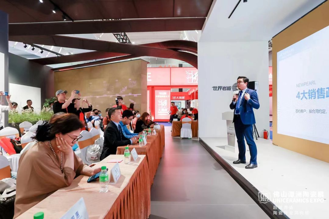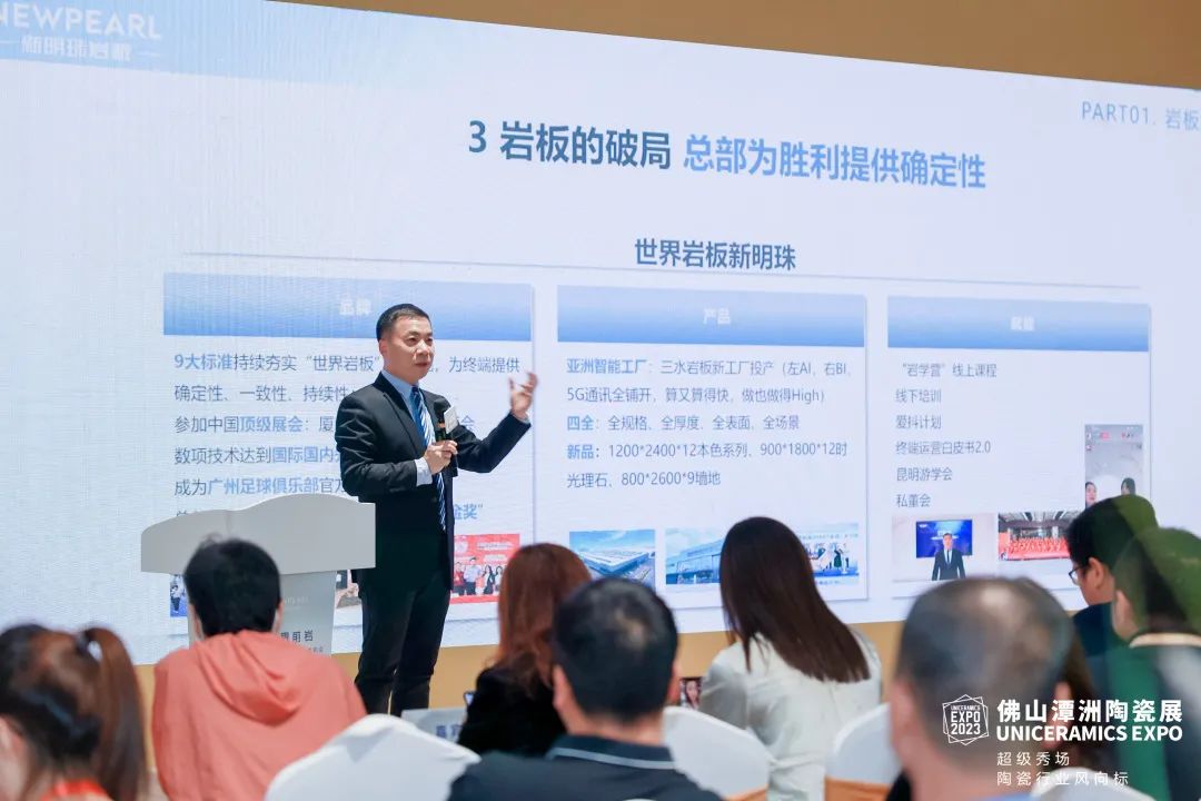 隨后,新明珠巖板事業部總經理梁風華登臺發表了“邁向高端”主題演講,會上梁總表示在邁向高端的道路上要堅持“世界巖板新明珠”高端定位,全方位夯實高價值基礎,研發高品質和高科技產品,從全過程高感動服務,全生態高信任運營,全場景高價值定制組成的“高端模式”出發,講述了新明珠巖板各區域市場高端模式運營的成功案例,希望更多有識之士加入巖板行業的制勝聯盟,與新明珠巖板一起,共同守護巖板的價值。03 春夏新品品鑒