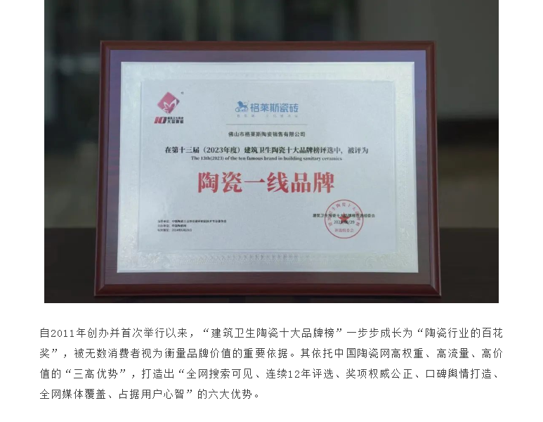 明珠匠心 | 格萊斯瓷磚榮獲“陶瓷一線品牌”榮譽稱號