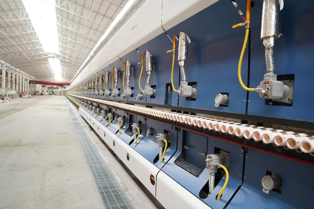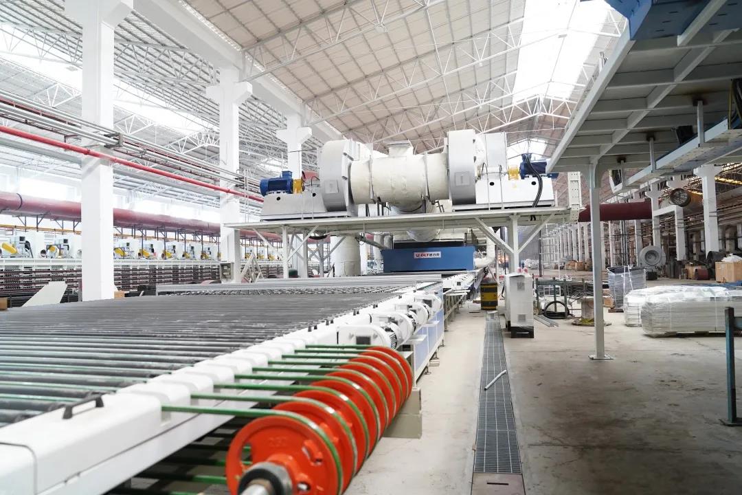 該線在生產設備的引進上,大量使用了先進的“國貨”:壓機為科達制造旗下最先進的16800噸大板壓機,不僅對磚坯的成形壓制及質量穩定性有很高的保障,還能夠自動反饋;窯爐引進徳力泰4.0+能效標桿巖板專用窯爐+干燥生產線,該生產線含天然氣寬體巖板窯YEB系統和高效五層干燥窯,具有能耗低、效率高、穩定性強、智能化程度高等優勢;釉線由陶機行業專業大板釉線制造公司廣東泰萊承建,自動化程度行業領先,關鍵位置全部由伺服控制,整線工程配有數據采集;同時還采用廣東美嘉最新款長板噴墨機,能通過3米長規格產品,無抖動無重影,畫面清晰。